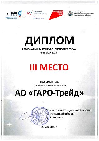 ГАРО традиционно принимает участие в данном конкурсе, и наша экспортная деятельность в 2024 году заслуженно была оценена номинацией «Экспортер в сфере промышленности»!